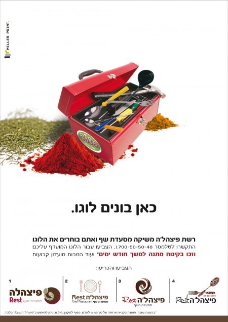 א-קיצער. רשת פיצה’לה בונים בעזרתכם לוגו עבור מסעדת-השף החדשה שלהם, את הלוגו הם מתכוונים לבנות מכלי בישול ותבלינים. אמנם לא התבקשנו לחוות דעה, ובכל זאת נתחצף ונאמר כדלהלן: להלביש שם של פיצה על מסעדת שף יוקרתית, זה בערך כמו להלביש את השם “מוניות-גאולה” על “רכבת-ישראל”, ולא משנה מה דעתו הלא-מקצועית של הלקוח בנידון. ובכל זאת, אם נתבקש לבחור אחד מתוך ארבעת הלוגואים, הלכנו על 4.