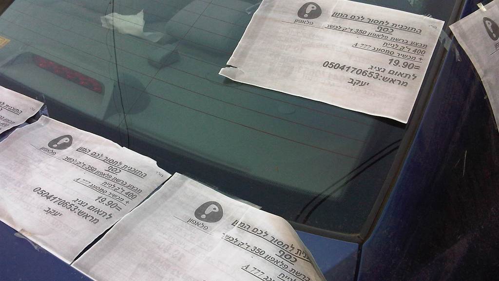 והניידת הכחולה של פלאפון ‘חטפה’ גם כמה דו”חות מפקחי העירייה בגלל שחנו על המדרכה ליד פיצה אורי