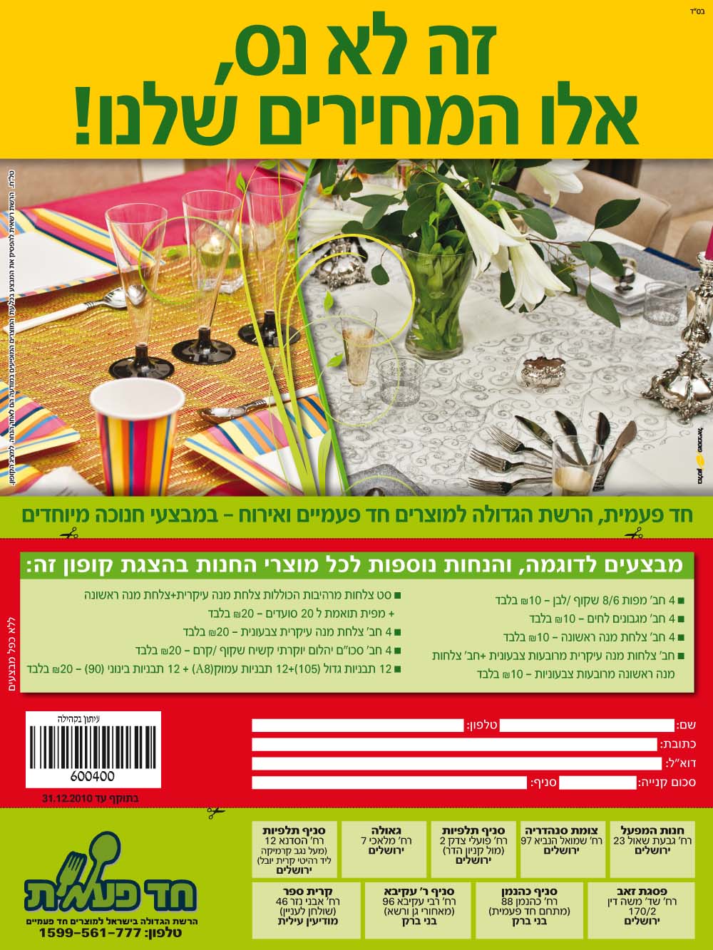 טרקלין יאקאב חשמל, הפתיעו לטובה, אחרי כמה פרינטים יבשים מבית מדרשם. אם כי באו לומר שחנוכה פטורה ממע”מ, והביאו לנו אותה בסביבונים ענקיים, בדמות מוצרי חשמל. ניסינו למצוא את ההקשר ביניהם, ונפלנו על הסבר מפולפל בכיוון של “ביני ובינך, סביבון, תנור נטול מע”מ, בא נסגור את זה בקטנה”. כלומר, תחושת הקטנת ערכו של המוצר בעל-העלות המשמעותית. הויזואל מזכה את הפרינט בניקוד גבוה יחסית.
