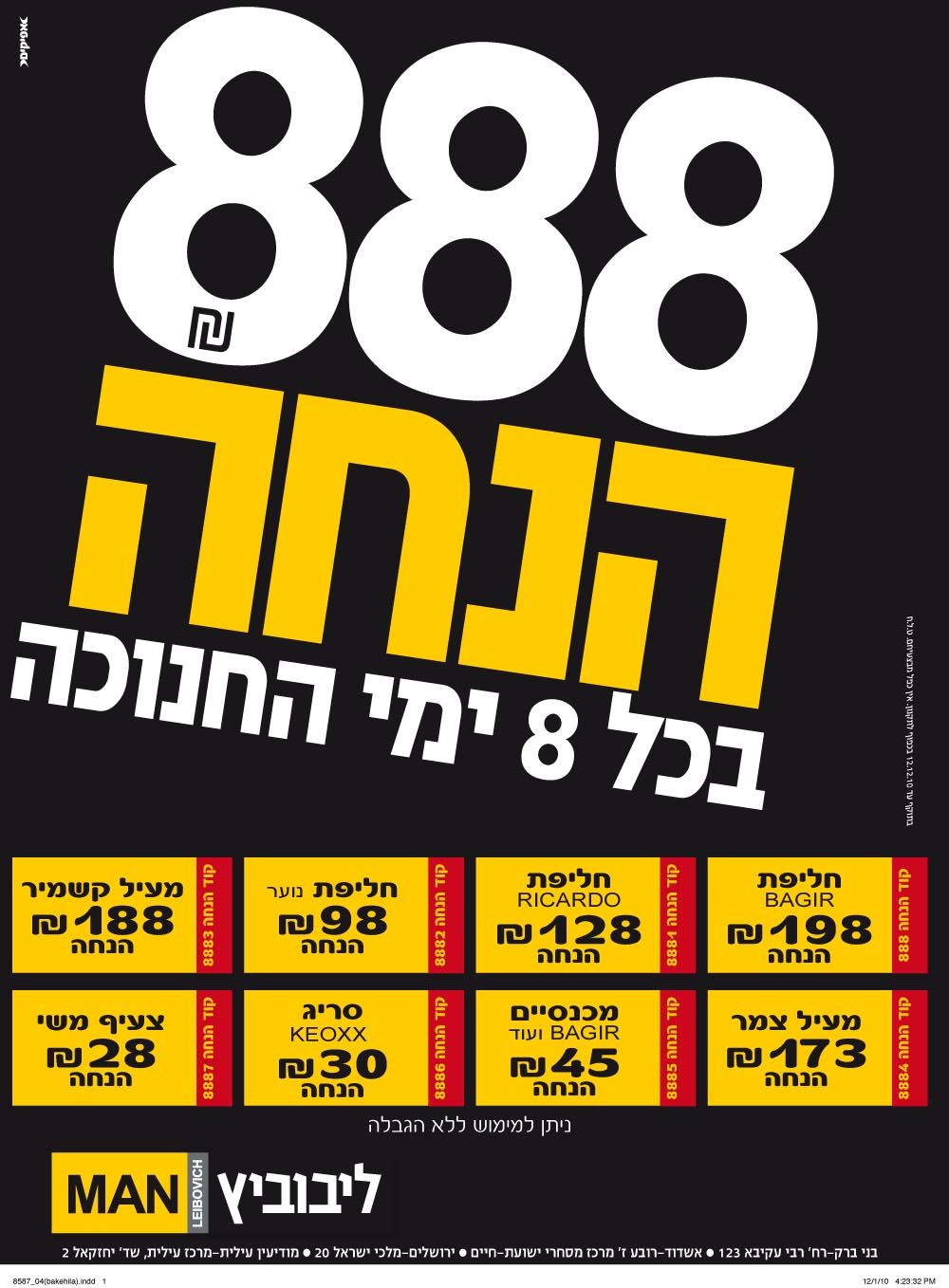 ‘אפיקים’ הבינו שדי נמאס מהתקפת הסביבונים, ולשם כך הלכו על מספר ימי החג. אם תהינו מה הקשר בין המספר הגלובלי של 888 ש”ח. מתברר שכל סכומי המבצע יחדיו מסכמים את הסכום הכולל של 888 ש”ח, כך זה כשצריכים פרש”י ותוס’ לפרינט הנוכחי. ולסיכום ביניים, רק אם תקנו גם מעיל קשמיר, וגם מעיל צמר, בתוסף  צעיף, חליפת נוער ועוד, תגרדו אולי את סכום ההנחה דלעיל. ומה זה אומר לצרכן הבודד אליו מופנה הפרסום?