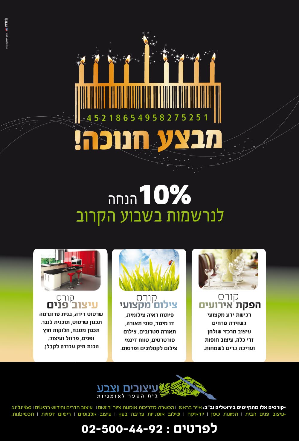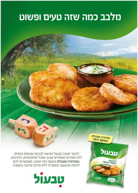 מאידך, ‘הצהובה הטובה’ תפסה אחלה טרמפ על מנהגי החנוכה, ובינהם אכילת מאכלי חלב. ‘יבנה מהדרין’ ניצלה זאת בדאבלים מרהיבים ומעוררי תיאבון, כאשר צלילי הקראנצ’ שבין השיניים נשמעים בתאי גזע המוח ולו ממבט חטוף. שימו לב על האומץ, הכותרת משחקת במילים של ‘לביבות’ ו’לבביים’, והצילום לא סופר את הלביבות ממטר, כאשר הוא מתמקד רק במשחק הלב. ועל הענין הזה, אשר ריחמו על יצורי האנוש והביאו לנו פרינט נטול סביבון ולביבה – מגיע להם שאפו.