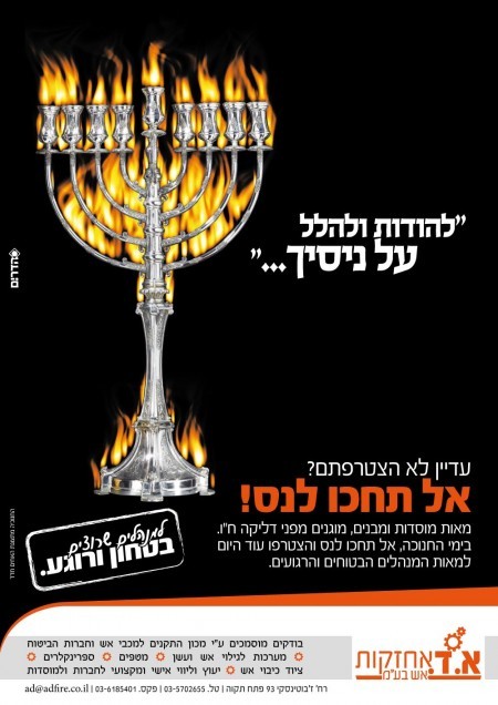 ולקינוח אקטואלי, אילולי המאורעות הטראגיים במורדות הכרמל, היינו מתעלמים מהפרינט נטול הקריאייטיב של א.ד. אחזקות אש בע”מ. אך כאשר יצא לנו להיתקע על הפרינט הזה כאשר לנגד עינינו נרות החנוכה, וברקע קולו הסדוק של רב קיבוץ ניר עציון המדבר אודות ספרי התורה שברכבו אותם הוא מבריח מהשריפה, אמרנו, וואלה, יצא להם איכשהו הקשר בין המנורה השרופה לאסטרטגיה שבשמירת ספרי התורה. ובמילה אחת. גרוע. אם כי טיפלה טוב יותר מהפרינט הקודם שלהם, שנסחט בחופזה מחמת אבל בית וויזניץ בשריפת ספרי התורה. שם הפרינט  מבית מדרשו של “הדרים” דמה יותר למודעה בינונית של “הכנסת ספר תורה” שכונתית.