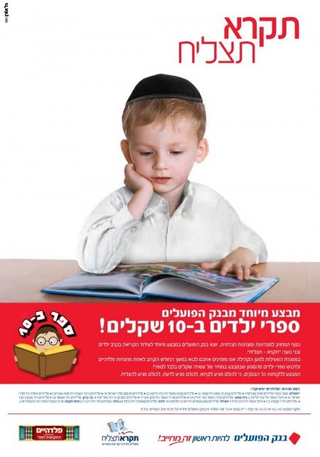 בשבוע הראשון למבצע ‘תקרא תצליח’ של בנק הפועלים נמכרו למעלה מ-3,000 ספרי קריאה לילדים ב-10 ₪ בלבד ברשת חנויות פלדהיים. בנק הפועלים השיק לפני כשבוע ולראשונה במגזר החרדי, את פרויקט ‘תקרא תצליח’. באמצעות פרויקט ייחודי זה בשיתוף הוצאת פלדהיים, בית הוצאה לאור מוביל בספרות התורנית, נרתם בנק הפועלים לעידוד הקריאה בקרב ילדים. פרינט של גל אורן BSD, קליק לקומוניקט המלא.