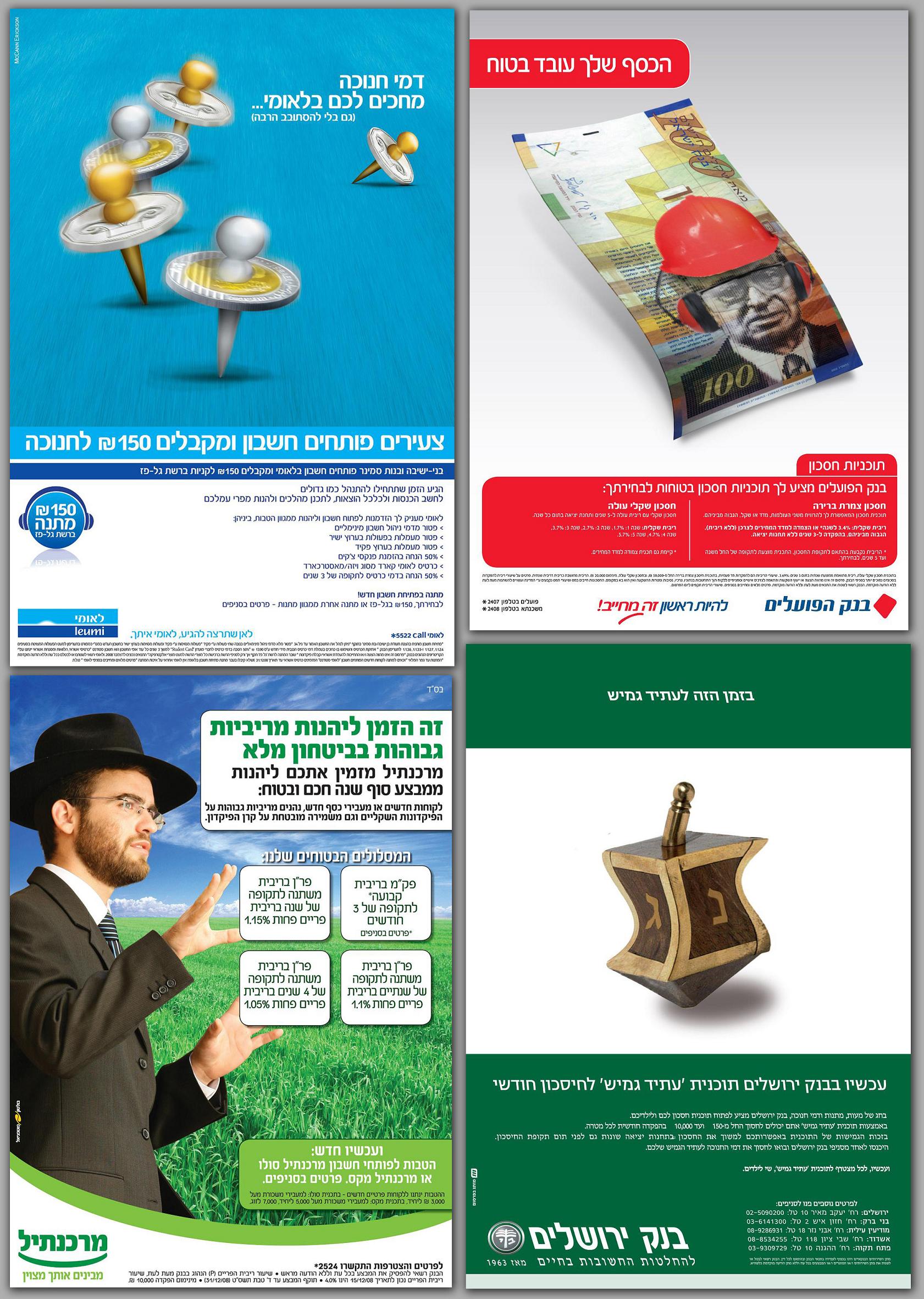 ובכן – מרכנתיל והפועלים לא הזכירו את נס חנוכה. מרכנתיל עמוס כמו תמיד עם ויז’ואל נדוש ולא מתאים. מעייף ומייגע. הפועלים במודעה חדשנית, קריאטיבית, מסודרת ויפה. בנק ירושלים עם סלוגן לא מחודד, גריד מיושן (כמו הבנק?) ובקיצור, שיעמום טוטאלי. לאומי לעומתם, עם כותרת ממש אבל ממש לא מטופחת, בניסיון מאומץ להכניס גם ‘דמי חנוכה’ וגם סביבון. נו, לא הצליח כל כך, חבל שהמחלקה החרדית לא יכלו לזרוק איזו מילה… השידור שלכם.