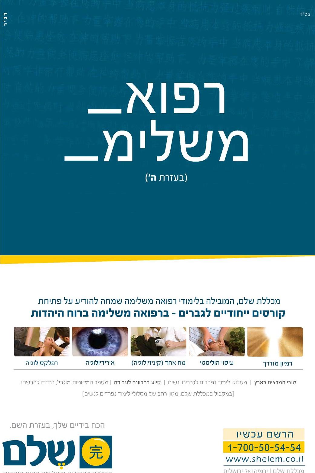 זו לא הפעם הראשונה שאנו מעלים פרינטים של מכללת שלם, ובוודאי לא של פרסום דביר. אני אוהב את ההמשכיות והקריאייטיביות (פחות את הסוגריים). מה שבטוח, שבחיי לא ידעתי שיש ביקוש כ”כ גדול לתחום הרפואה האלטרנטיבית במגזר החרדי.