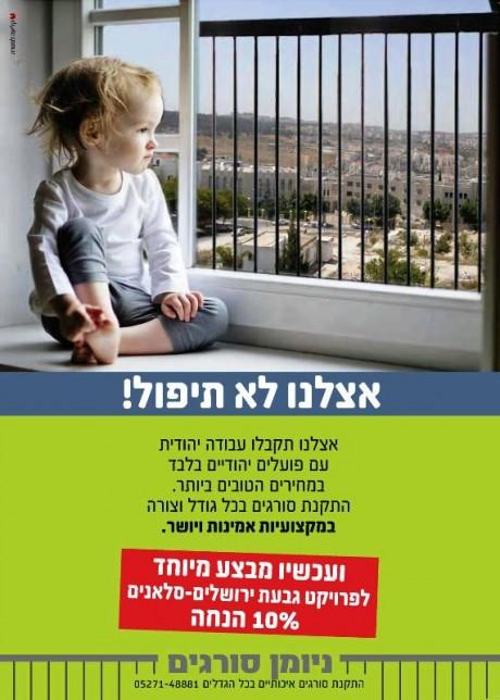 מודעה יפה מבית ‘קליעה למטרה’ – העיצוב פשוט ויפה, המסר חד וברור, אולי קצת צובט. אני לא יודע כמה אנשים ‘נפלו’ בגלל שהמתקינים היו ‘לא-יהודיים’. במודעה נכתב “אצלנו תקבלו עבודה יהודית, עם פועלים יהודיים בלבד”. ואני אומר, מי צריך פועלים יהודיים כשהעבודה היא יהודית? אבל בלי להתקטנן, המודעה פשוט טובה. כמעט נפלתי מהכיסא.