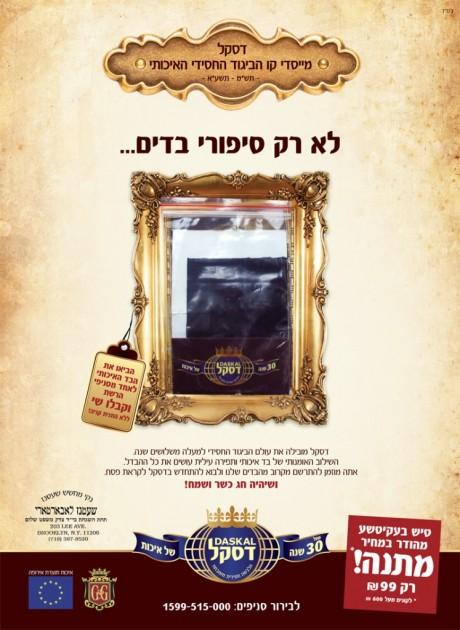 לאחרונה יצאה ‘דסקל’ בקמפיין מעניין, המכיל מידע רב אודות החברה ופועלה. הקמפיין הביא בשורה חדשה ומקורית ללקוחות – “תרגישו את האיכות בידיים”. באינסרט מושקע שצורף לעיתוני ‘המודיע’, ‘בקהילה’ ו’קול העיר’ – צורפו פיסות בד ממיטב התוצרת של חליפות G&G. עם פתיחת האינסרט קיבלנו כתבה מקיפה על החברה ובשער האחורי תמונה מסורתית מרגשת. לקוחות שהגיעו לסניפי הרשת עם פיסת הבד, קנו חליפות וקיבלו מתנה. לייק.