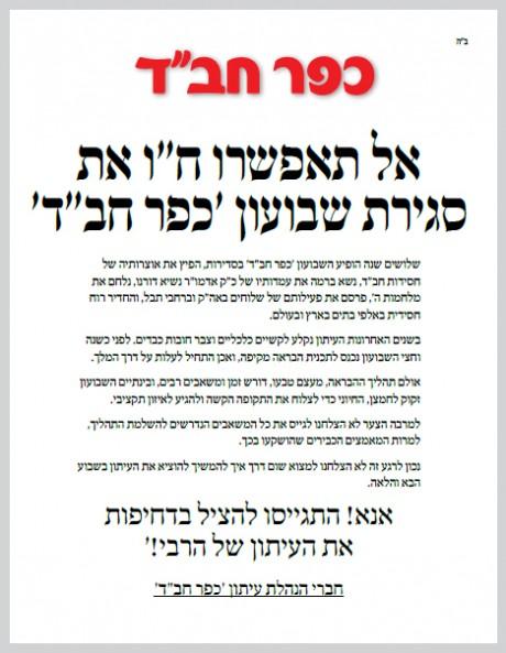 בלאגן בכפר חב”ד: עיתון ‘כפר חב”ד’ המיתולוגי לא יצא לאור השבוע, היות והוא נקלע למצוקה כלכלית שלא מאפשרת לו להמשיך את פעילותו השוטפת. “אני לא מבקש תרומות”, צוטט הרב מנחם ברוד ב-COL, “רק חמצן”. הרב מנחם ברוד הוא מנכ”ל העיתון והראיון נערך על ידי מנחם כהן, הפעם תחת הכובע הקנייטשי של COL.