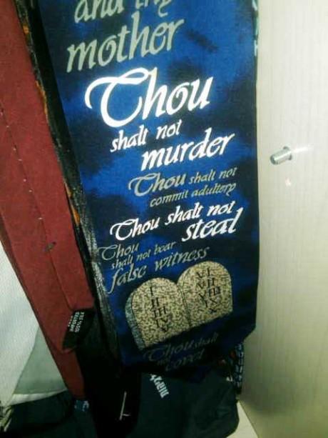 הבהרה והתנצלות: במהדורה הקודמת פרסמנו תמונה של עניבתו החגיגית והחלבית של קובי סלע. כתבנו כי “אומרים שהוא חיפש עניבה עם שני לוחות הברית אבל היא הייתה שבורה, אז הלך על הפרה”. מסתבר שטעינו. העניבה עם לוחות הברית + עשרת הדברות באנגלית עומדת על תילה במתקן המיוחד.