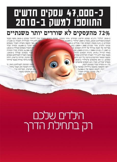 מקורו של הטקסט שבמודעה הוא באתר הלמ”ס. הכותרת של הטקסט המקורי כפי שמופיע באתר היא – כ47000 עסקים “נולדו” ב2010. (אגב, המרכאות על ה’נולדו’ הן במקור !). בפרסום גל חשבו שכותרת שמזכירה לידות תתאים בול לקונספט. מה שהם לא לקחו בחשבון זה שהמבקר לא יאהב את המילה הזו בפונט כל כך גדול, ויחליף אותה ב”התווספו” חסר משמעות. התוצאה – כותרת שהקשר שלה לקמפיין על חסכון לילדים לוטה בערפל עד לא קיים.