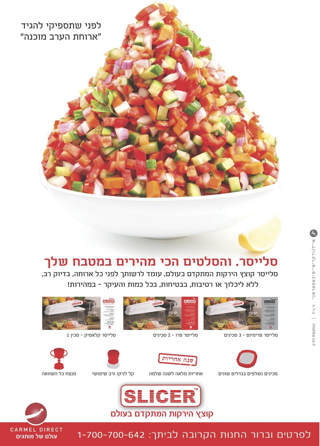 כרמל דיירקט, חברה לייבוא מותגים למטבח, החלה בשנה האחרונה בפעילות פרסומית ושיווקית למגזר החרדי. בין המוצרים אותה מייבאת החברה תמצאו את ה”סלייסר” – מערכת סכינים לחיתוך ירקות. לאחר תקופה בה עבדו בכרמל דיירקט ישירות מול המדיה המגזרית, הקפיצו האחרונים למשימת הקריאייטיב והאסטרטגיה את אייל גור שעשה חריש מחקרי, עליו נשענת תובנת הפרסום. רק חבל שאין פה המלצת קריאה, לא קשה לנחש מה היה כתוב בה.