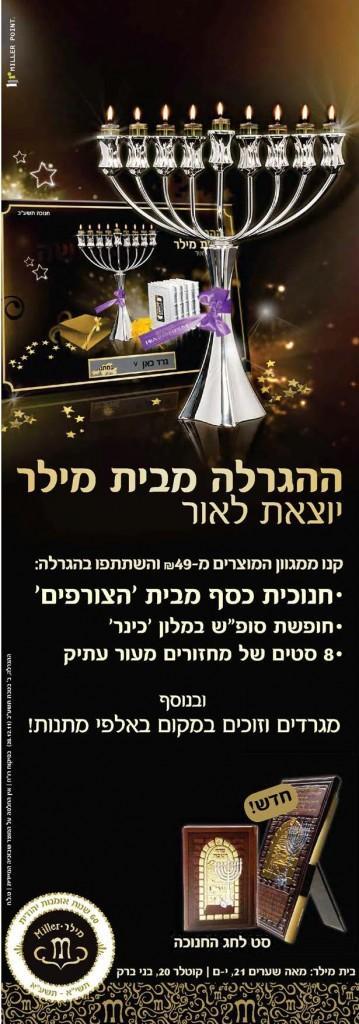 מילר מחלקת דמי חנוכה: לקראת חג החנוכה הקרב ‘מילר’ מדליקים לכם אור יקרות “אור של קדושה” ונותנים לכם חנוכיה מבית הצורפים מתנה ועוד מתנות בשווי אלפי שקלים.