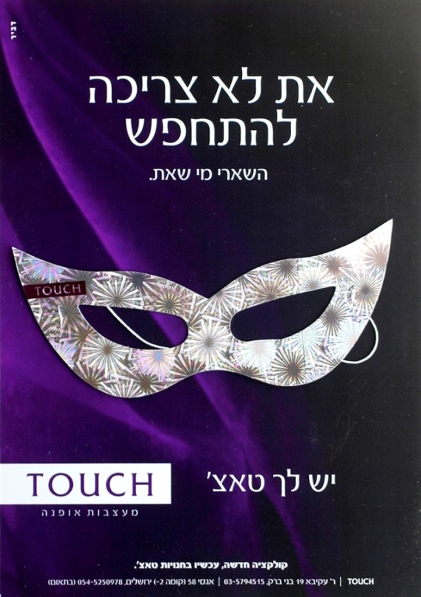 מעניין אם המודעה הזו היתה עוברת את וועדות הכשרות למינהן אם היו מתרגמים אותה לשפת הקודש ובמקום touch היה מופיע על המסכה “גע”.