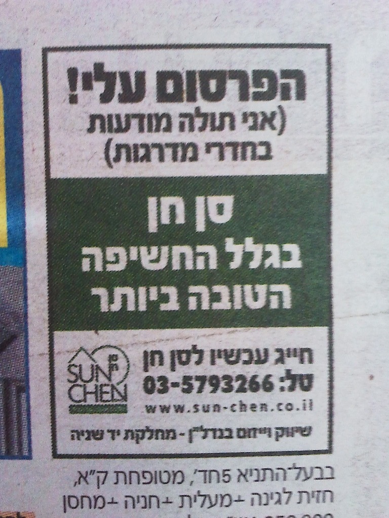 תמיד ידעתי שסן חן מתעסקים רק בפרויקטים, לא ידעתי שגם בדירות יד שניה ,אבל פרסומת חזקה ביותר, באמת לא צריך משרד פרסום עם כזה פרסומת טובה ,כל הכבוד לסן חן(או ליח”צ של סן חן)
