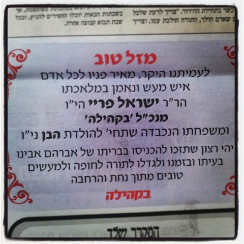 מזל טוב לישראל פריי מנכ”ל עיתון בקהילה לרגל הולדת בנו.