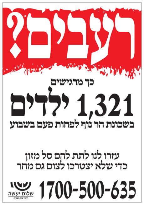 הקיבה המצ’וקמקת שלי עדיין מתלבטת אם היא כואבת משמונת סעודות החג או שהיא רעבה מצום גדליה. בכל מקרה, הפלאייר הזה – שנוצר עבור עמותת “שלום יעשה”, המחלקת מאות סלי מזון בשבוע – מופץ בשעות אלה בשכונת הר נוף בירושלים.