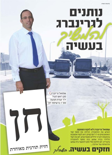 “לכן בשלב הזה, בחרנו לחבר את המועמדים פרסונלית באופן חזותי ודביק לצד שם המפלגה החדשה תחת האותיות ‘חן’ שזהו מותג מוכר לכל אחד בעיר כגוף הנותן שירותים תרבותיים רחבים לכלל הציבור החרדי (מחלקת חן חרדי תחת ניהלו של שמוליק גרינברג סגן ראש העיר מטעם דגל התורה) כאשר הויזואל של המועמדים עצמם המוכרים לכל יתחבר עם שם המפלגה. וכך, ניצור זהות ואהדה אחידה.