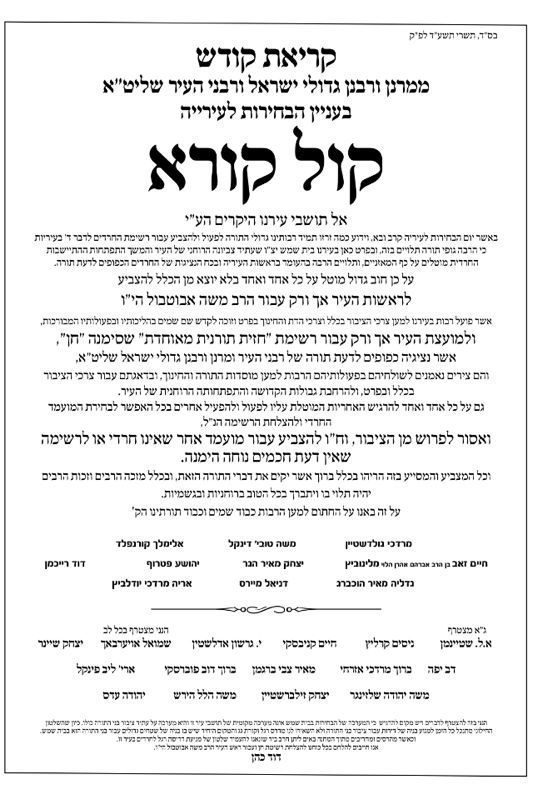 הסקרנות הגדולה שליוותה את מערכת הבחירות אצל הבוחרים הליטאים (ובכללם גם אלו שבכלל הגיעו מאזורים החורגים בהרבה מגבולותיה הגאוגרפיים של מדינת ליטא) הייתה בשיאה לאחר שיהדות התורה בעיר התפלגה לשלוש מפלגות שונות. החסידים מהחלק האגודאי של יהדות התורה (גור, בעלזא ויז’ניץ ושאר החצרות) דרשו לעצמם את המקומות הראשונים בטענה שהם הרוב בעיר. בעקבות פרישתם של אלו ממפלגת האם, התעוררו קבוצות בתוך אגודה ודרשו את שלהם בראשות הרשימה. אותן קבוצות המשתייכות לפלג הכלל חסידי התפלגו מאגודת ישראל והקימו מפלגה עצמאית. כך יצא שממפלגה אחת יצאו שלוש. דגל התורה, אגודת ישראל והכלל חסידית – כאשר כל קבוצה טוענת לכתר.
