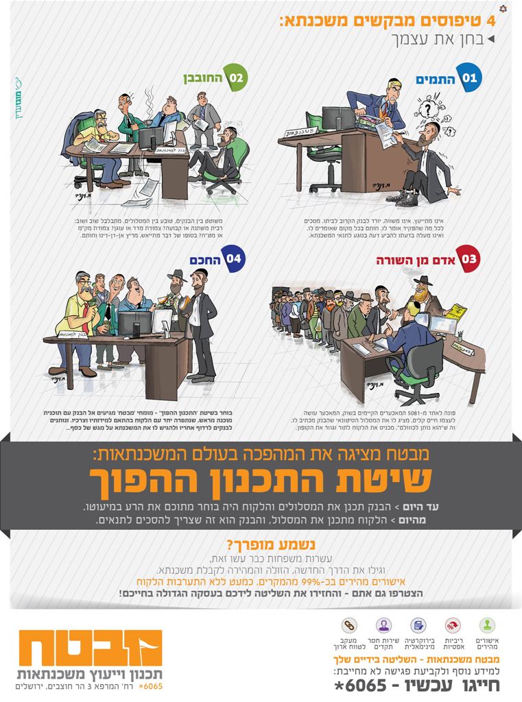 לאחרונה עלה קמפיין טיזרים מעניין לחברת ‘מבטח’ – תכנון וייעוץ משכנתאות, תחת הכותרת “4 טיפוסים מבקשים משכנתא – בחן את עצמך”. ארבעת הטיפוסים הם, איך לא, התמים, החובבן, אדם מן השורה והחכם. שלושת הראשונים נתקלים בבעיות מהותיות ולא יודעים איך לצאת מזה. האחרון, החכם מכולם, בוחר בייעוץ המומחים.