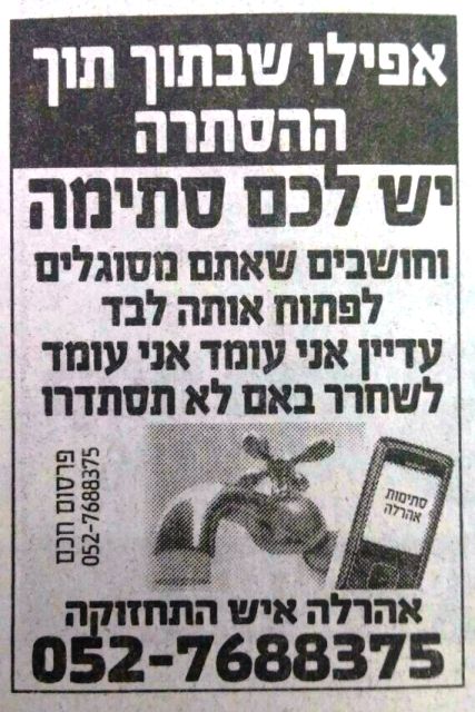 אהרלה הוא אינסטלטור מיוחד: גם יודע לפתוח סתימות, ממש בתוך ההסתרה, וגם יודע לעשות “פרסום חכם”. מספר הטלפון במודעה חוזר על עצמו – גם ללקוחות בלי מזל שהצנרת שלהם נסתמה, וגם ללקוחות פוטנציאלים בתחום הפרסום. כזה עוד לא היה לנו כאן, אז התקשרנו כדי לתהות על קנקנו.