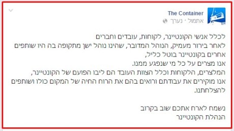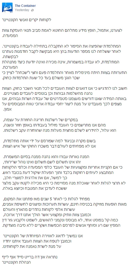 בתמרון מבריק הצליחה מסעדת “הקונטיינר”, באמצעות תגובה מנוסחת בקפידה בפייסבוק, להעצים משבר יחסי ציבור ובשילוב של חוסר הבנת המדיה החברתית (המנה האכולה נארזת עבור המלצר וכו’) ויהירות מרושלת (המתלמדת לא התקבלה בתחילה לעבודה), הצליחה לגרום להעצמת סיקור שלילי ראשוני, ולמנף אותו לכתבות בתקשורת וחרם גולשים רחב.