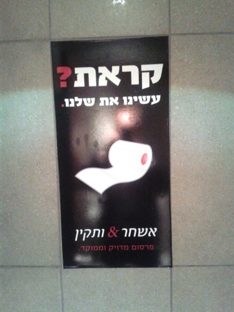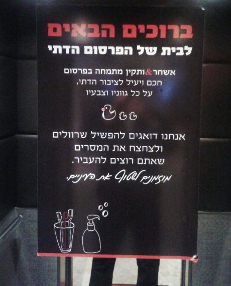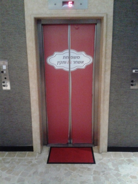 בתמונות: המעליות מבחוץ ומבפנים (שלוש מעליות) ומדבקה בקיר השירותים.