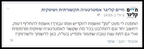 השבוע נפתח דף פייסבוק בשם: “חיים קליגר – אסטרטגיה תקשורתית ושיווקית”. בסטטוס הראשון כתב קליגר:
