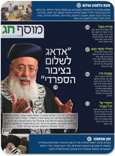 כתבת השער הראשית היא כאמור עם הרב עמאר, כשהכותרת היא “אדאג לשלום בציבור הספרדי” וזו ההבלטה בשער וגם במשנה של הכתבה, בעוד נושא השלום הספרדי הוא למעשה רק החלק האחרון ביותר של הכתבה והמיעוט שבה. נכון אמנם שלכאורה – עד כמה שידינו משגת – זו באמת הפעם הראשונה שהוא מדבר בהרחבה ובפתיחות כזו על הנושא הלעוס, וחושף את דעתו המלאה בנושא.