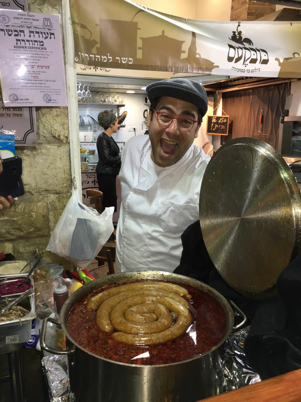 למה ההודעה הצליחה להפתיע ולרגש אותי? כי השולח היה לא אחר מאשר ידידי אברימי קליגר, מנכ”ל ‘המדריך החרדי’, שהחליט להמשיך במסע המשותף עם שותפו משכבר הימים רפי האוסדורף ולהצטרף אליו לפתיחת טשולנטיה תוססת בתוך הסצנה הירושלמית הידועה: ליל שישי במחניודה. האוסדורף (להלן: בתמונה לצד הקישקע האימתני), העומד על סיר הבשר ומי שאחראי שלא תצאו רעבים, מגשים חלום נוסף ובסופי שבוע הוא מתכוון להאכיל את כולנו במצקת. מה, לא נבוא?