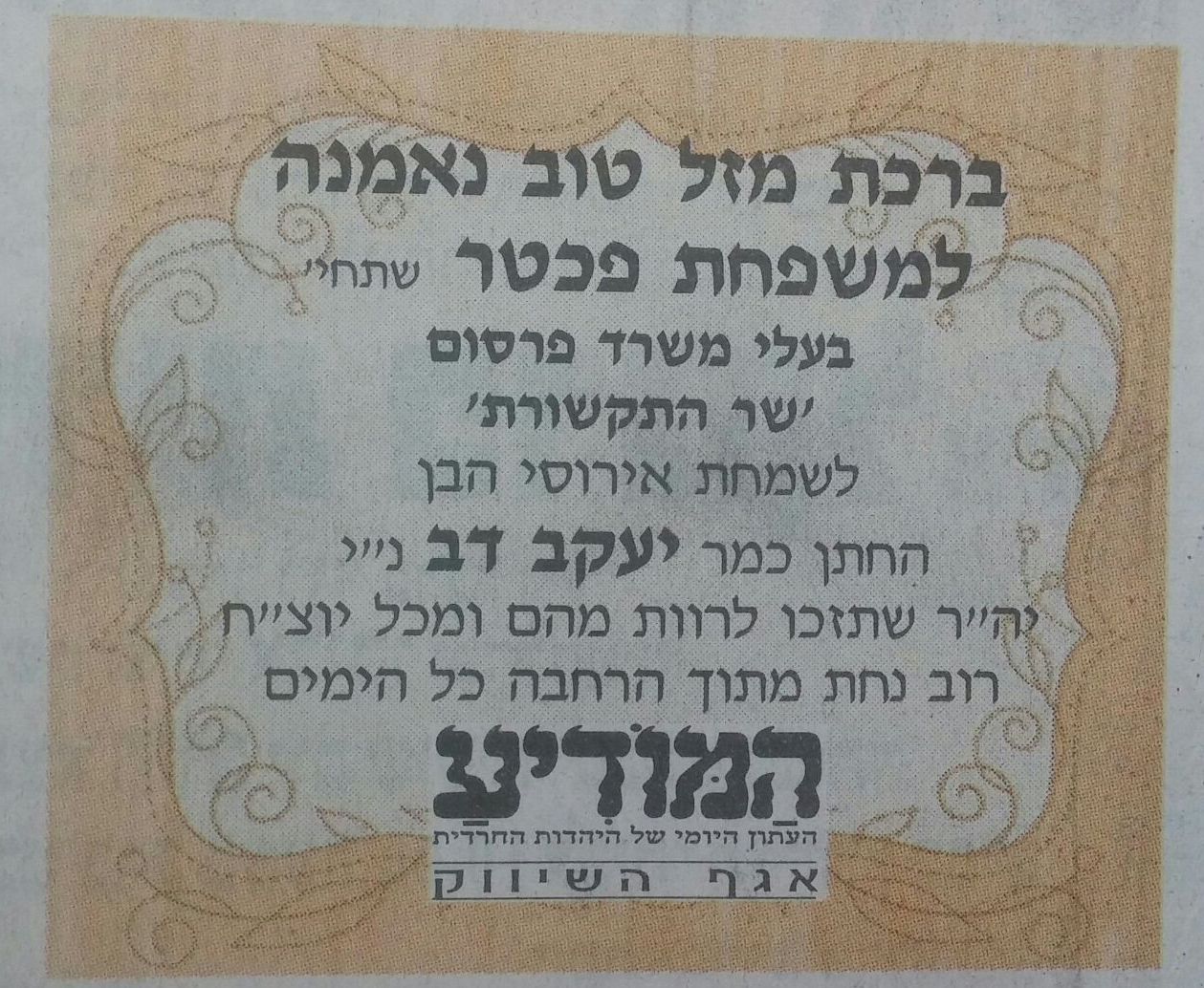 כולנו מכירים את מעלליו של המבקר בעיתון ‘המודיע’ ואת צנזור השמות הפרטיים של הגברות, הנקבות והנשים בעולם. הפעם, העיתון ניסח ברכה למשפחת פכטר (חשוב להם לפרגן לכל המשפחה, לא רק לשרה) לרגל שמחת אירוסי הבן, ולציין כמובן את הסיבה בגינה המשפחה הנכבדה זוכה בברכה חמה: בעלי משרד פרסום וכו’.