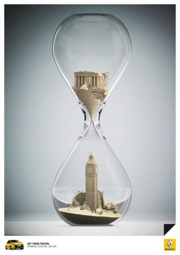 קמפיין למותג הרכב רנו קליאו העושה שימוש בשעון חול כדי להוכיח את מהירות הנסיעה תחת הסלוגן: להגיע ליעד מהר יותר.