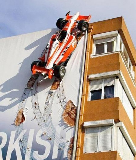 פרסומת למרוץ מכוניות בטורקיה מציגה מכונית מרוץ דוהרת על בניין.