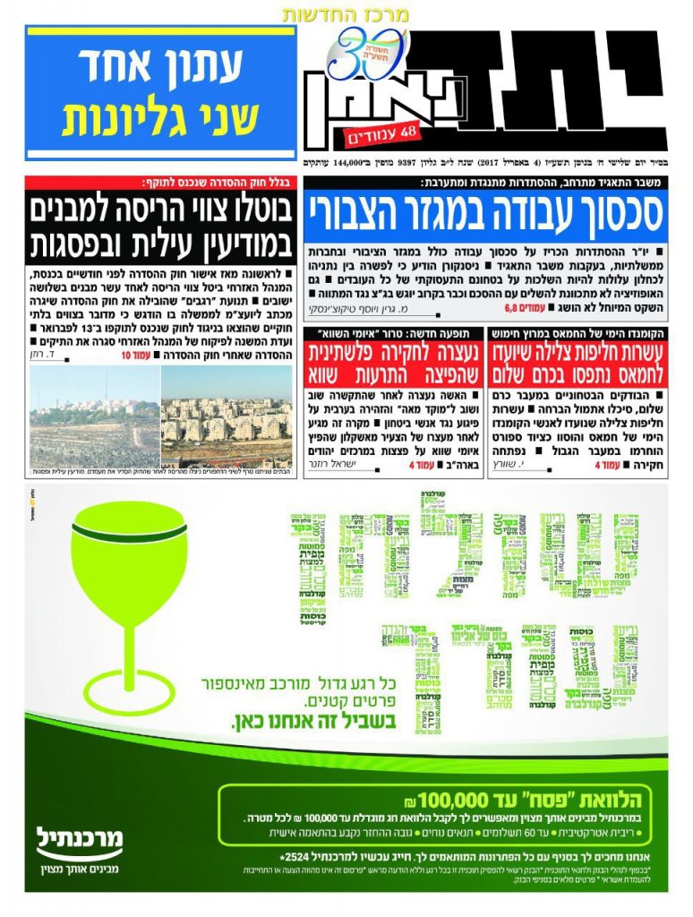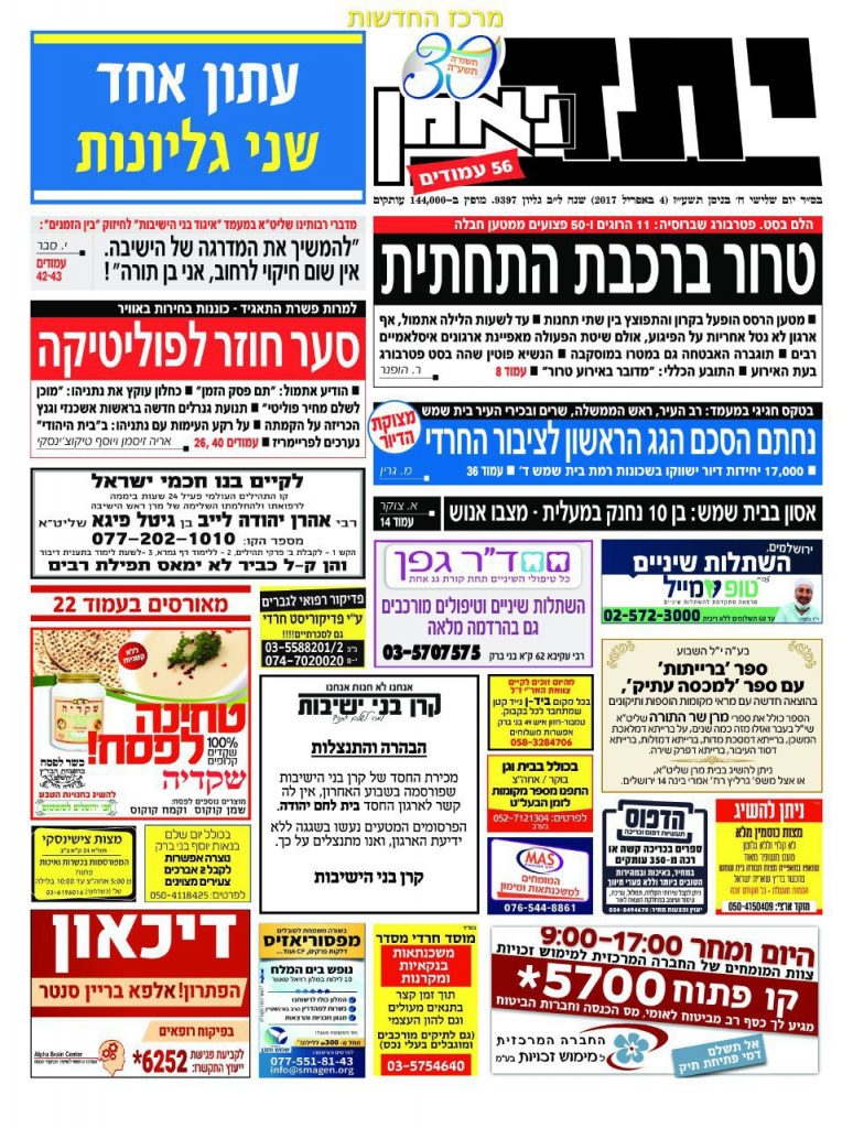 עיתון יתד נאמן המופץ חינם בימי שלישי הוציא הבוקר שני גיליונות עיתון המכילים בסה”כ מעל 100 עמודים כשכל גיליון כולל גם עמוד ראשי נפרד עם כותרות שונות.