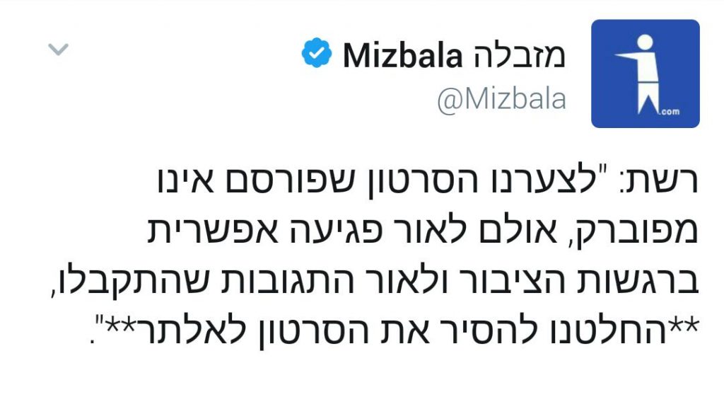 אתר המזבלה ציטט בטוויטר תגובה של רשת: הסרטון אינו מפוברק, אולם החלטנו להסיר את הסרטון לאלתר.