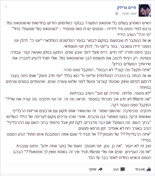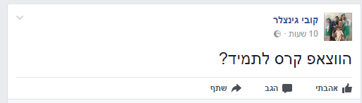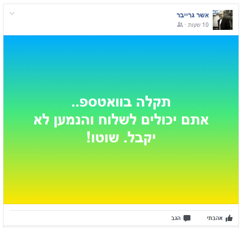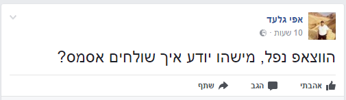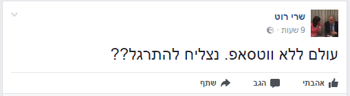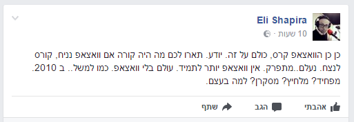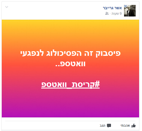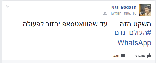 מסתבר שאתמול נרשמה שעה של בהלה רבתי בקרב בעלי הסמארטפונים. אפליקציית ווטסאפ קרסה והעולם נכנס לסחרור רגעי. ואני? אני בכלל לא ידעתי. יכול להיות שגם אתם לא הייתם יודעים, לולי נכנסתם לפייסבוק וראיתם עשרות סטטוסים של חברים בנושא. העניין הוא שאני לא שמתי לב עד עכשיו: בוקר יום חמישי, בשעה 10:13, אחרי שהגעתי לעבודה, טיפלתי במשימות החשובות של הבוקר ונכנסתי לפייסבוק (במחשב של העבודה) כדי לטפל בעוד כמה לקוחות.