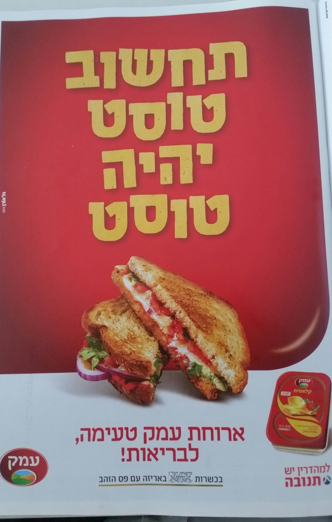 בזמן האחרון החליטה מחלבה ישראלית בשליטה סינית להעלות קמפיין להגברת המודעות לטוסט. במודעות מעוצבות להפליא מביט בך בביישנות טוסט פריך, נוטף גבנ”צ כמו שצריך, מה שגורם לקורא להזיל ריר ולאלו ששומרים על בריאותם – מסוכר, לקטוז וגלוטן – להרים עיניים לשמיים ולשאול, למה?