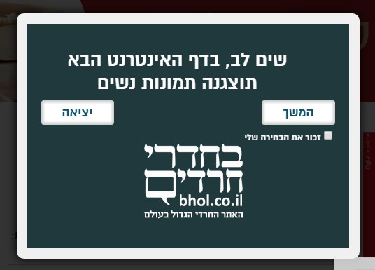 כולנו מכירים את הנוהל של ‘בחדרי חרדים’ הנמנע מפרסום תמונות נשים מחוץ למדור “לובי נשי”. גולש שיבקש להיכנס למדור “לובי נשי” יצטרך לאשר בתיבה מיוחדת שהוא מבין את המשמעות של הגלישה במדור לנשים בלבד. השבוע גילינו לראשונה אייטם במדור החדשות הכללי שהכיל תמונות נשים והודעה מיוחדת קפצה לנגד עינינו. אולי זה נוהל עתיק, אבל אנחנו נתקלנו בזה לראשונה וחשבנו כי מדובר במכשול חמור וגולשים בלתי אחראים עשויים ללחוץ “המשך” ולהיכנס לכתבה המכילה תמונות נשים בלי לחשוב פעמיים.