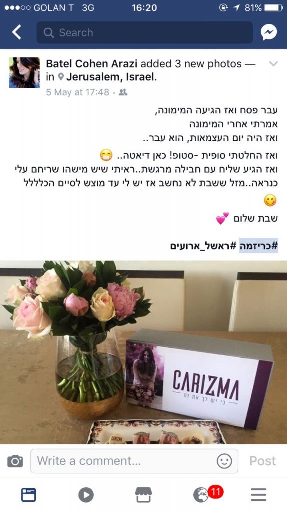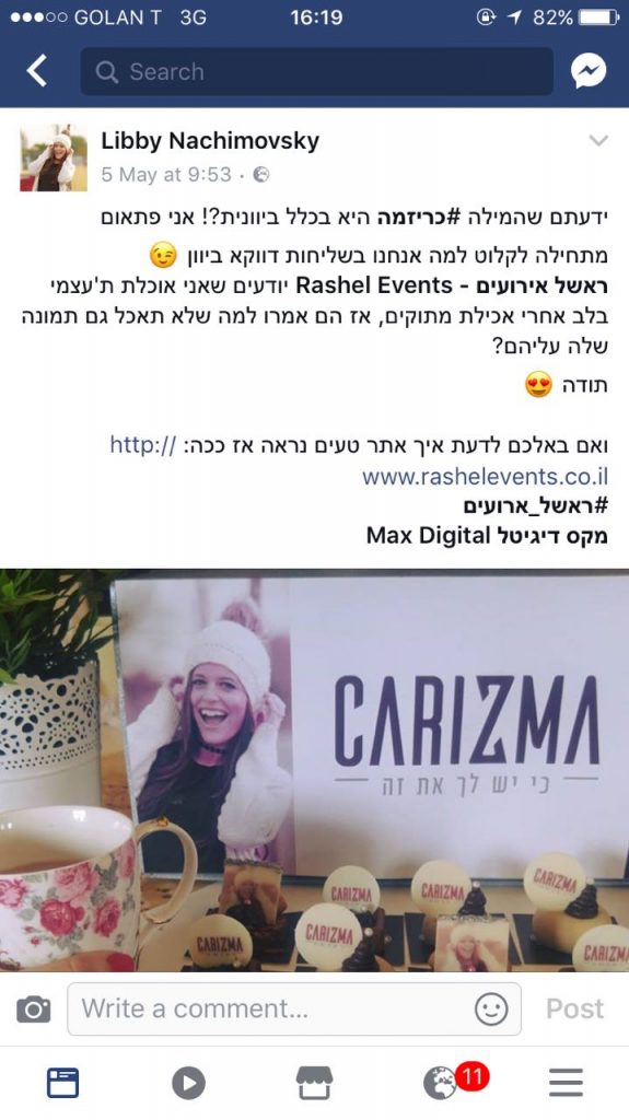 מקס דיגיטל השיקו את “כריזמה” ולקחו צעד אחד קדימה את נושא מובילי דעת הקהל ברשתות החברתיות. הפעילות הראשונה נעשתה בשיתוף פעולה עם ראשל אירועים, שקיבלה פידבקים טובים והמון הזמנות. הפעילות הראשונה מבית “כריזמה” יצרה שיח נרחב בפייסבוק + אינסטוש ואיך לא – גם גולשים וגולשות ממורמרים שהתעצבנו על זה.