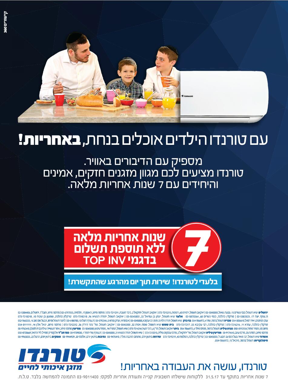 אחרי שנים של פעילות מצומצמת במגזר החרדי, טורנדו חוזרת לפרסם לקראת עונת הקיץ באמצעות משרד הפרסום קישורים360 של רחלי גרינוולד. אנחנו לא בטוחים אם שליש מזגן מסוגל לקרר משהו, אבל אם היו מציגים לנו קצת יותר מזגן, מישהו שם היה נופל מהשולחן. תראו איך הם צפופים שם, לא פלא שחם להם והם צריכים להתרענן?