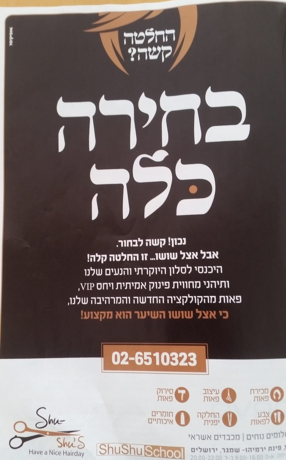 הרוב כ”כ חסר קריאייטיביות, עם שיער מציץ מהפינה.. דווקא כאן יש המון מקום לקריאייטיב מתוכחם (המגזר שלנו מאותגר, מה לעשות. ברור שהכי קל – ומוכר (בצירה) לשים דוגמנית עם פאה..)