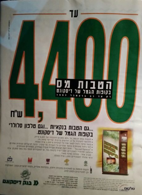 מצד שני, אני מנסה להתפקס ולראות מה בין דורנו לדור הקודם. האם מדובר רק בטיפוגרפיה שונה? תמימות שאיננה? האם המודעות הללו בפונט עדכני היו מתפרסמות היום והיו קולעות למטרה? חלקן, לדעתי הענייה, כן. אם כי אי אפשר להתעלם ממודעת דיסקונט עטוית מלל מעייף עם הטבה בדמות סלולרי של סלקום. היו ימים.