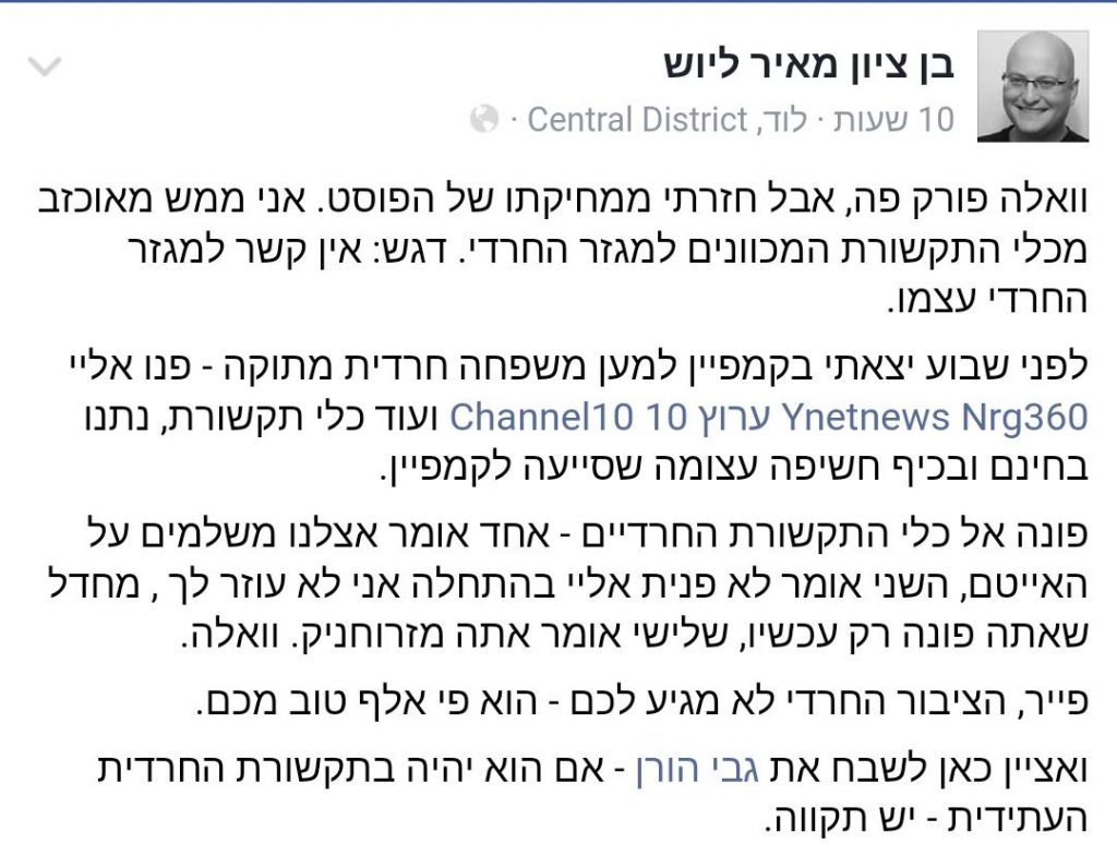 לאחר שהנחה פאנל שוויוני בנושא תקשורת חרדית, מנדי גרוזמן סיפר בערוץ 11 על תופעת החרדים החדשים המחפשים דרכים לשלב בין חיי ההלכה לישראליות. היה שם גילוי נאות.