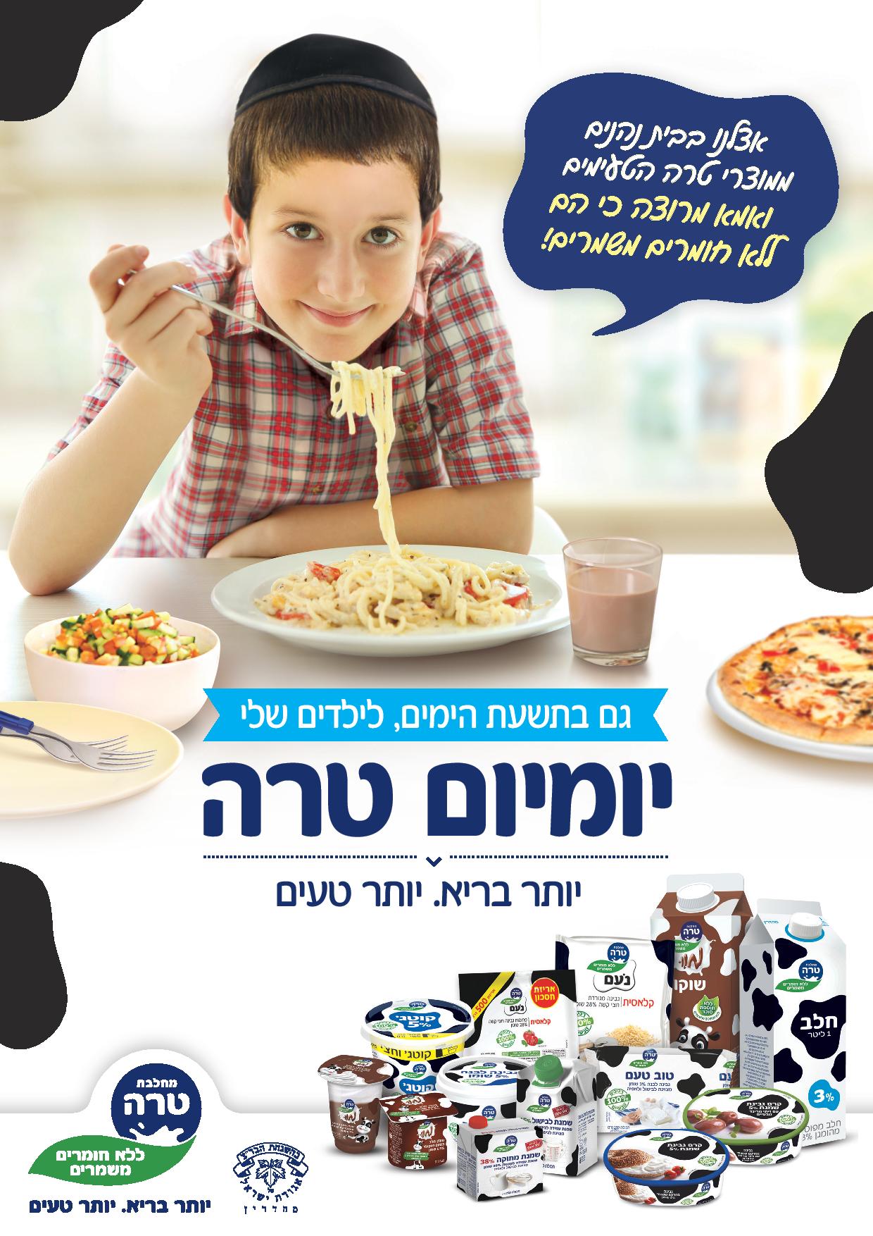 תחת הכותרת “יומיום טרה” ממשיכה המחלבה להפיץ את מסרי הבריאות שלה “גם בתשעת הימים”. המודעות של מימד מעוצבות בטוב טעם והילדים האותנטיים עושים את העבודה. הבריף השיווקי מאלץ אותם לעשות שימוש חוזר במוטיבי הבריאות והטעם, וכך זה נראה במודעה הזאת: טעים (3 אזכורים), בריא (2 אזכורים) וללא חומרים משמרים (2 אזכורים). ובכן, אמרו לי, הבנתם כבר מה היתרונות המובהקים של טרה?