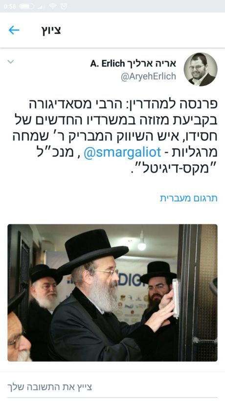 אנו שמחים בשמחתו של ידידינו שמחה מרגליות שחנך משרד חדש. הרבי מסדיגורא קבע מזוזה. אריה ארליך פירגן בטוויטר.