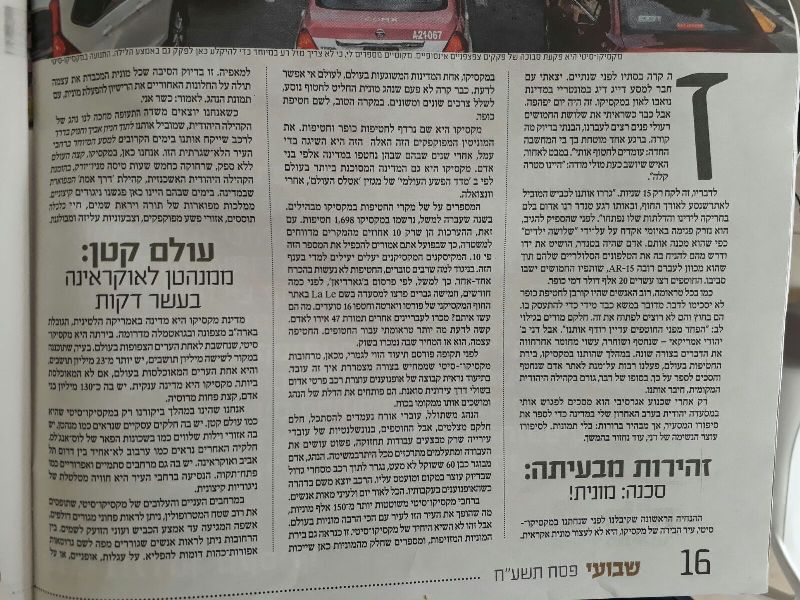 כאן מצאנו את הכתבה עליה כבר הרחבנו קודם, על החטיפות במקסיקו, שיצאה מרתקת במיוחד. אלא שהערה לצידה: הכתבה הזו כנראה נשלחה להגהה או עריכה, אבל בתקלה מוזרה שגם בה לא נתקלנו מעולם, בכתבה הודפסו יחד גם הגרסה המקורית וגם הגירסא המתוקנת והערוכה. זה לא היה קריא לחלוטין (בערך שני עמודים כך, עד שזה הסתדר). הנה כמה משפטים לדוגמא, שהודפסו ממש כך בעיתון: “ברגע אחד מוטחת בך בי המחשבה החדה”; “אבל דני ב’, שנחטף ושוחרר, עשוי מחומר אחר חווה את הדברים בצורה שונה”; “את המוניטין המפוקפקים הזה האלה הזה, היא השיגה” (ממש כך זה מופיע); “המדינה המסוכנת ביותר בעולם לפי ב’מדד הפשע'” וכן הלאה. לא ברור איך קרתה פדיחה.