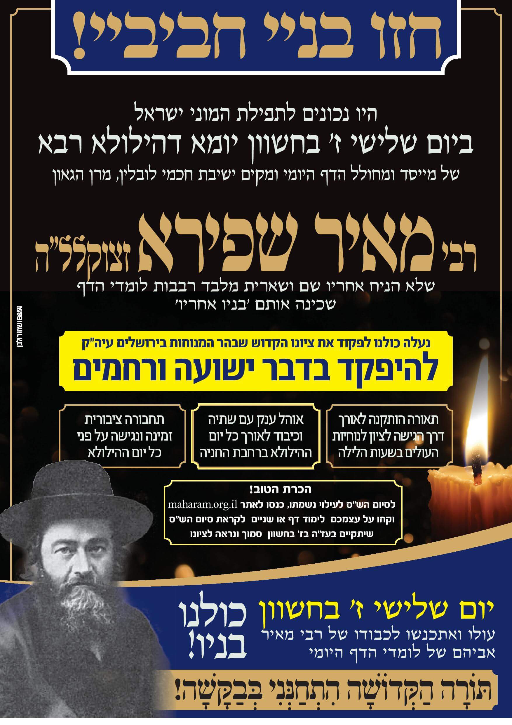 עשרות אנשי פרסום ומדיה נרתמו לטובת מיזם מדהים, קמפיין ענק לעידוד עלייה לקברו של מחולל הדף היומי, הרב מאיר שפירא מלובלין, שיום פטירתו יחול בתאריך ז’ במר חשוון. מי שעומד מאחורי היוזמה וההפקה הוא איש האסטרטגיה חיים קליגר.