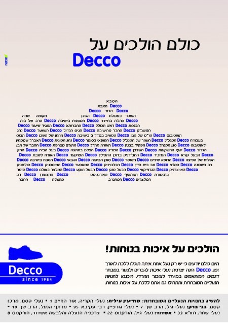 הסגנון הזה של הונדה הזכיר לי מודעה נוספת, מבית ‘מנטה’, שפורסמה אף היא ב’מרכז העניינים’ לאחרונה, לנעלי דקו. אם שאלתם, וגם אם לא, ‘נעלי דקו’ נכנסים למגזר החרדי באמצעות המשרד המרענן ‘מנטה’. מה אפשר לאחל? שיילכו בדרכים ישרות!