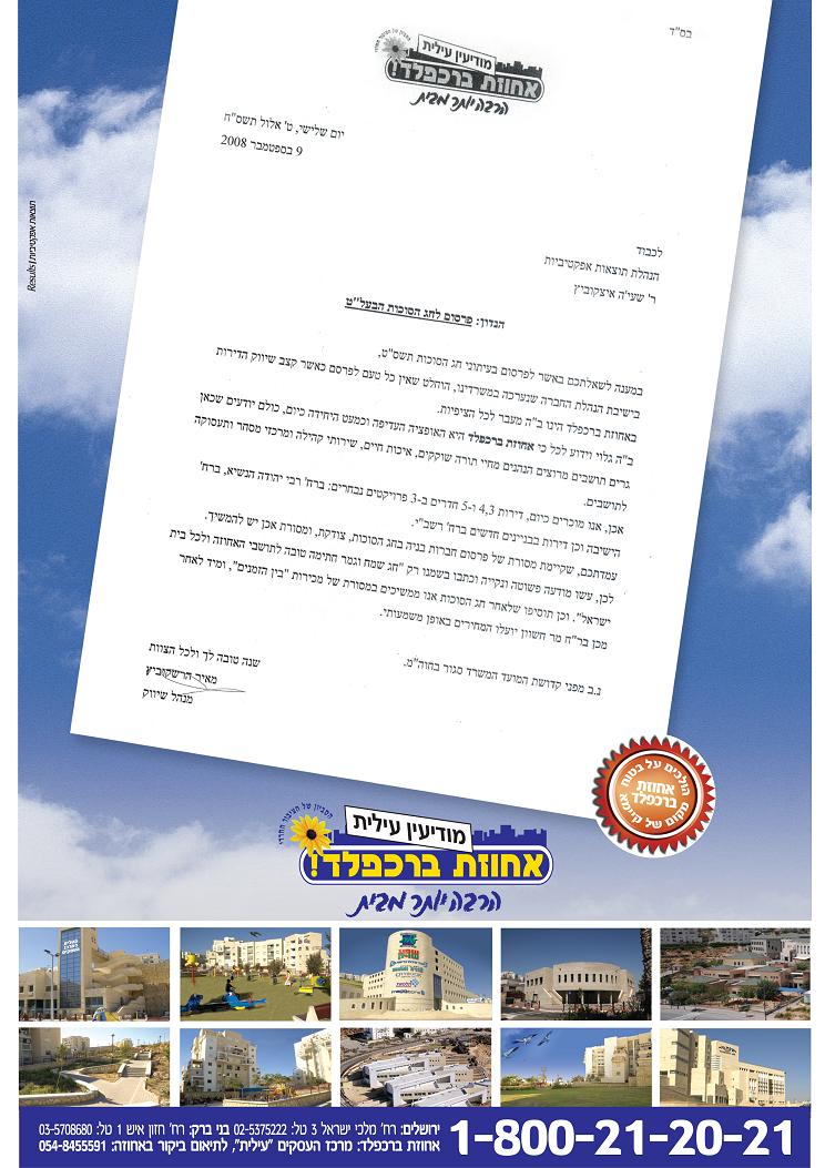 הרעיון כנראה קסם בעיני מנהל השיווק של אחוזת ברכפלד, שהחליט לפנק גם אותנו – החרדים – בגימיק הזה. אם הרעיון היה שלו, או של תוצאות אפקטיביות, הייתי מצדיע להם על הגישה החדשנית למודעת פרסום חגיגית. אבל בגלל שזה גזירה לא איכותית מהמשביר, ובגלל שהיו יכולים להדביק את זה בצורה יותר חכמה בלי שנרגיש, אני לא יפרגן מכל הלב…
