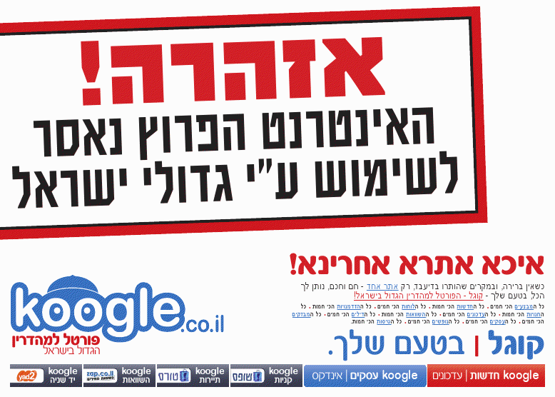 2. מה הם הסיכויים שמי שראה את המודעה דלהלן מכסה את הפרסומת דלעיל יכנס לאינטרנט ויקליק את האותיות koogle.co.il? [התשובה מתחת לתמונה]