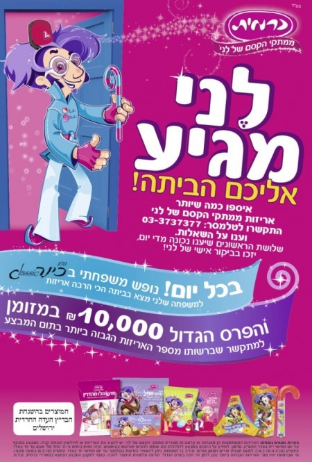 המבצע של לני לא שונה ממבצעים גדולים אחרים, שכולנו מכירים. אוספים עטיפות, חשבוניות, פקקים וכל הוכחת קניה אחרת וזוכים בפרס כזה או אחר. הצבעים של המודעה עזים. יפים. מתוקים. מקסימים. בולטים. אין כאן יותר מדי קריאייטיב, יש כאן מודעה מכירתית ואין שום סיבה שהיא לא תעבוד כמו שצריך. הדמות “לני” של כרמית המתנוסס על אריזות הממתקים, נתפס כחבר טוב של הילדים ועל פי עדות אנשי החברה, רבים פונים אליהם על מנת לקבל פריטים של לני לצורך תחפושות לפורים. נו? מישהו שם במקאן מתכוון לייצר תחפושות?